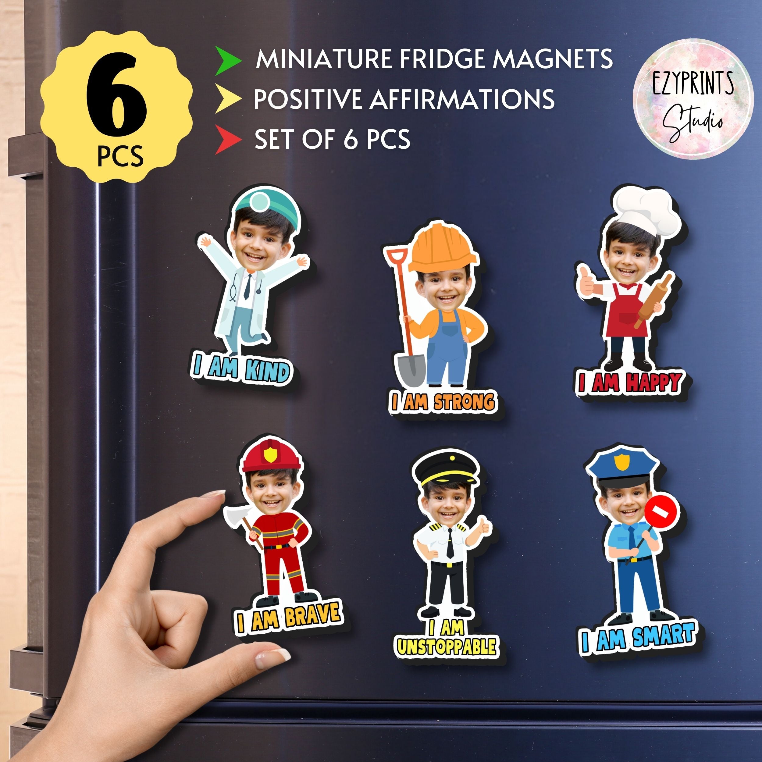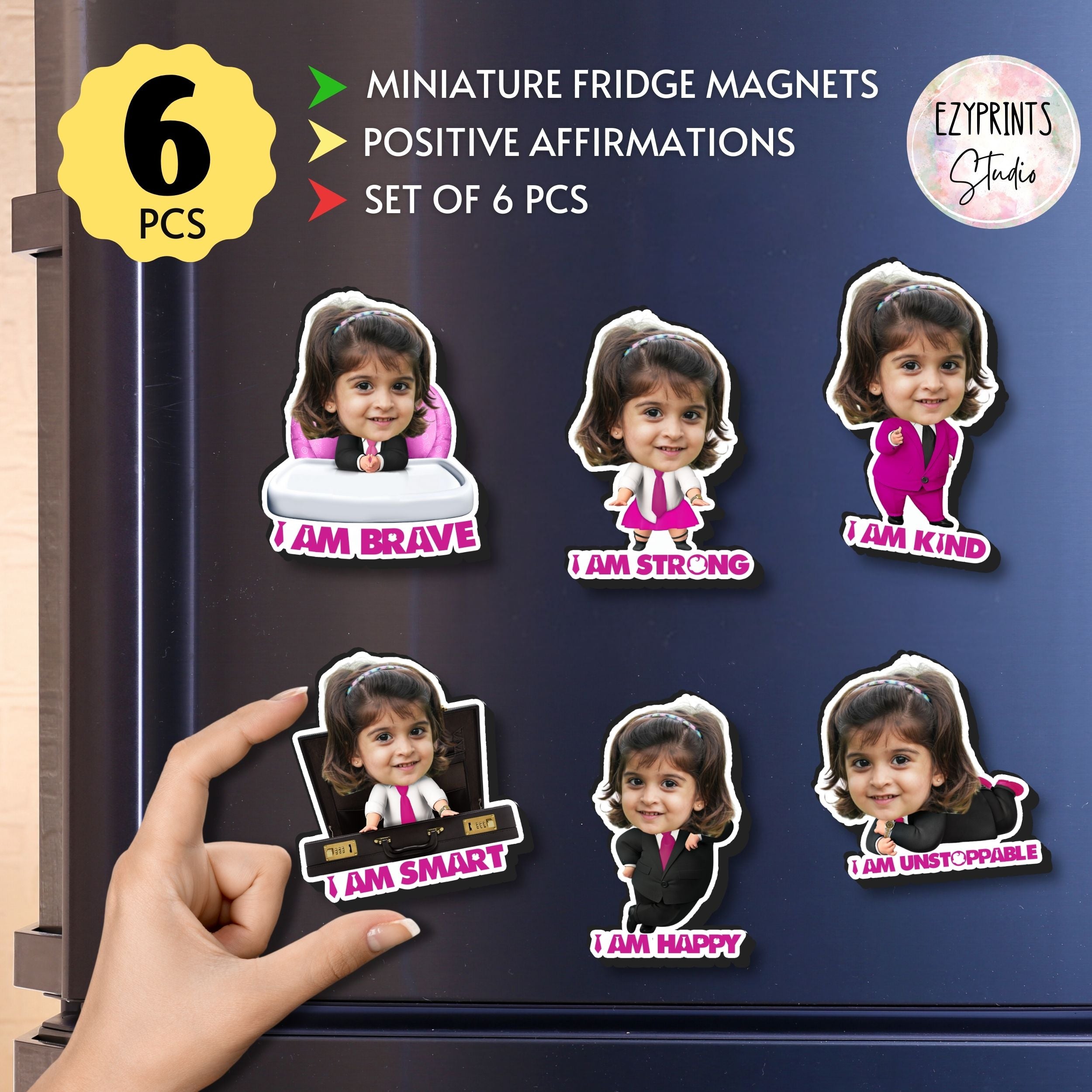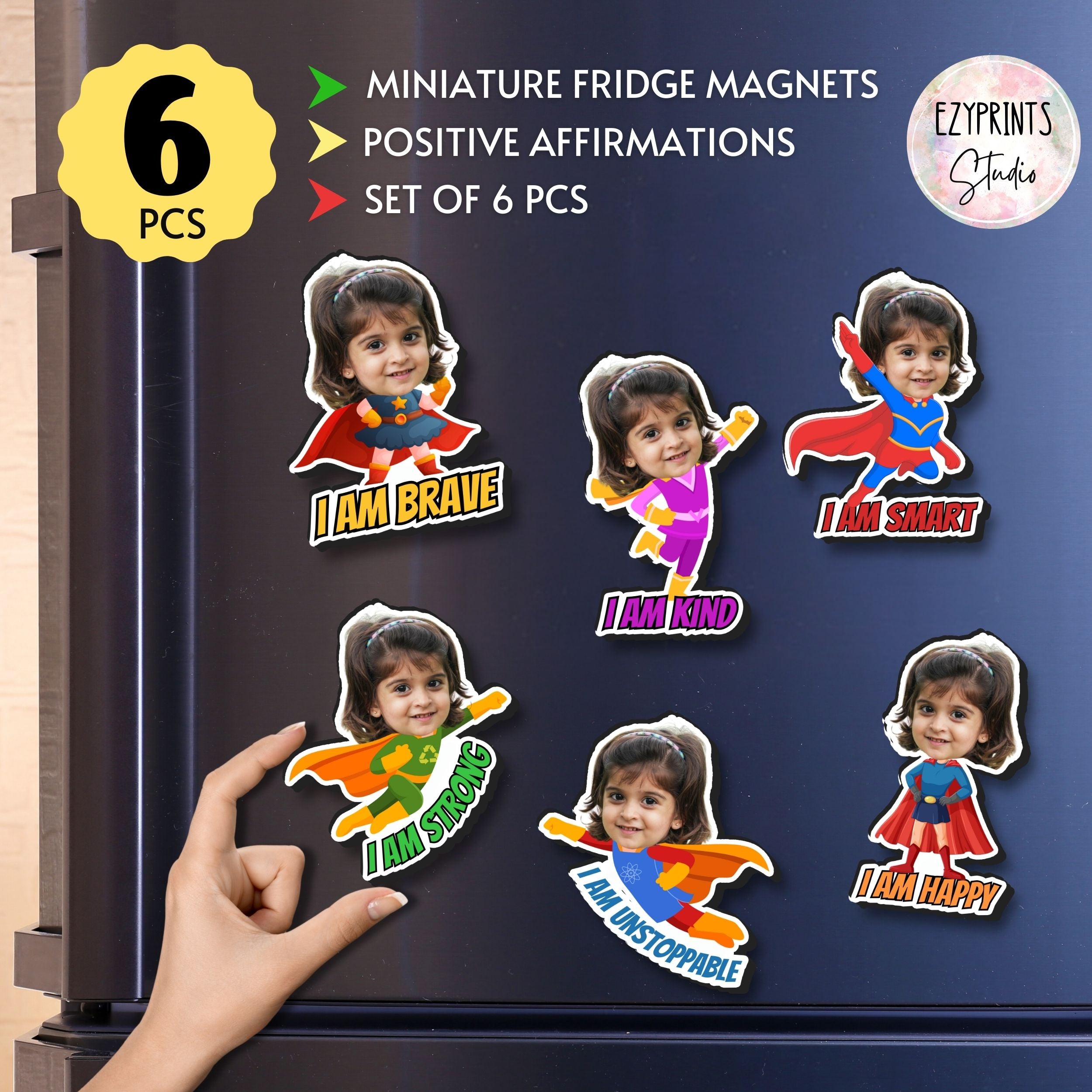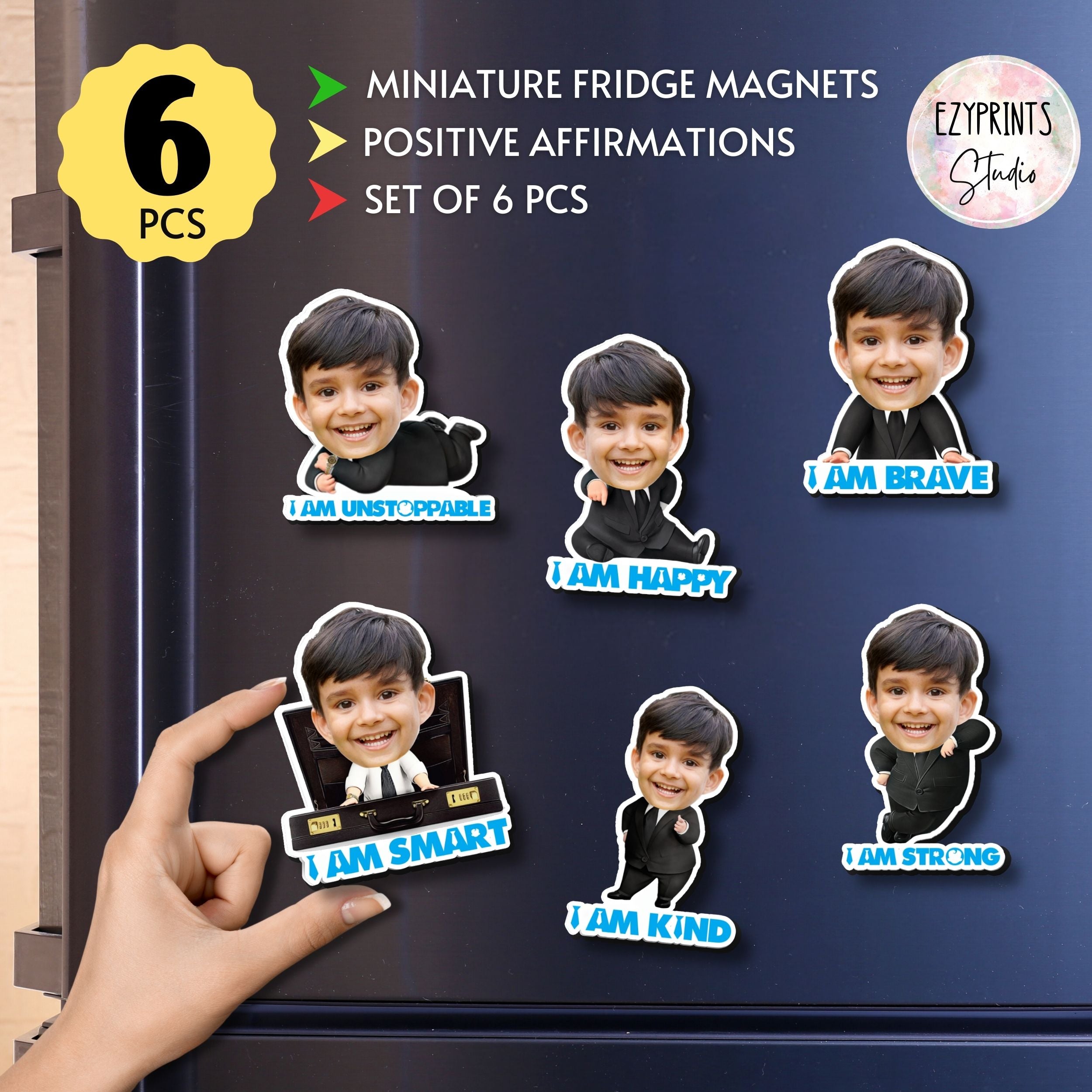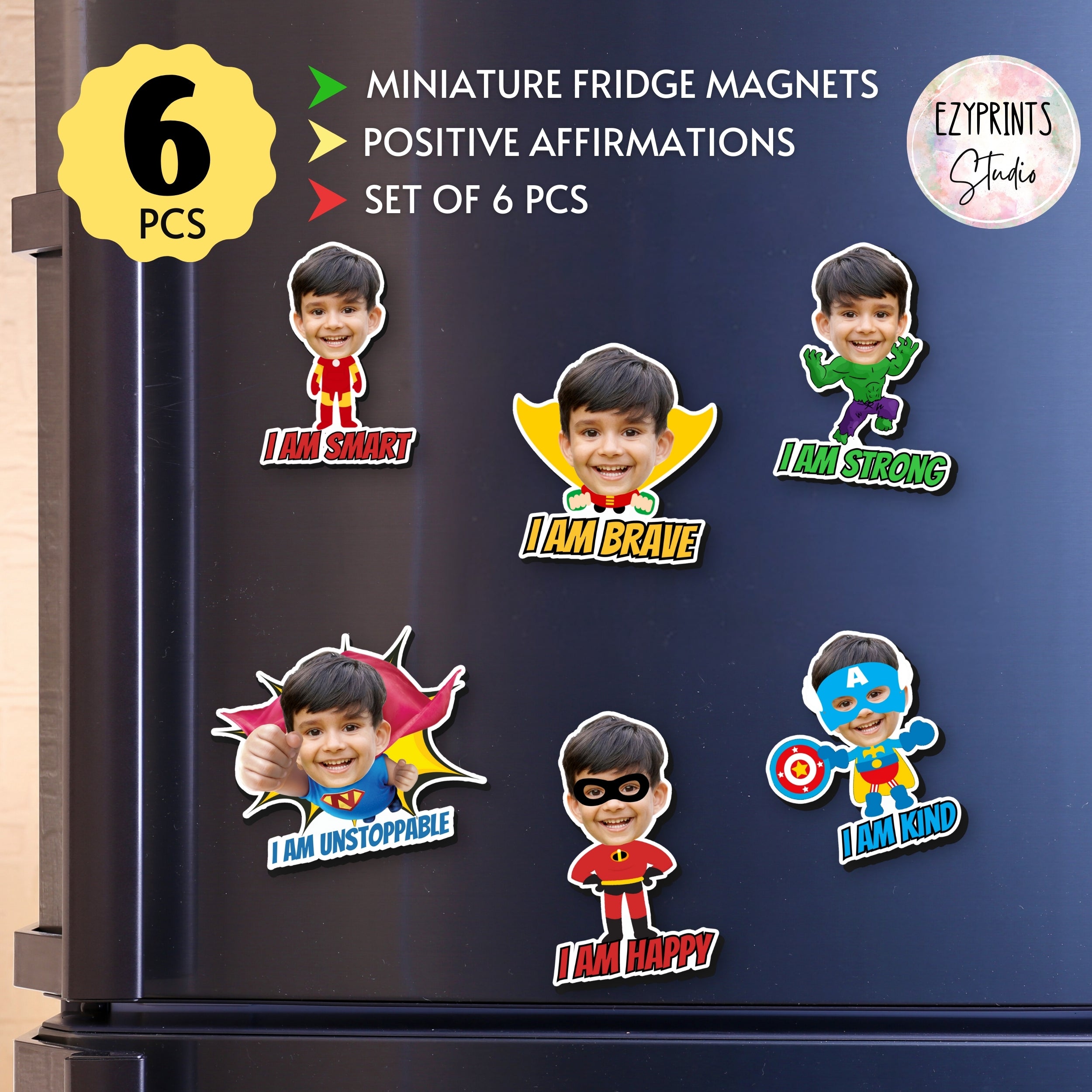 Brighten up your fridge and inspire your little one every day with our Custom Miniature Kids' Fridge Magnets! These adorable, personalized magnets feature your child's face and body in fun themes like superheroes and boss baby, complemented by uplifting daily affirmations to boost their confidence and self-esteem.