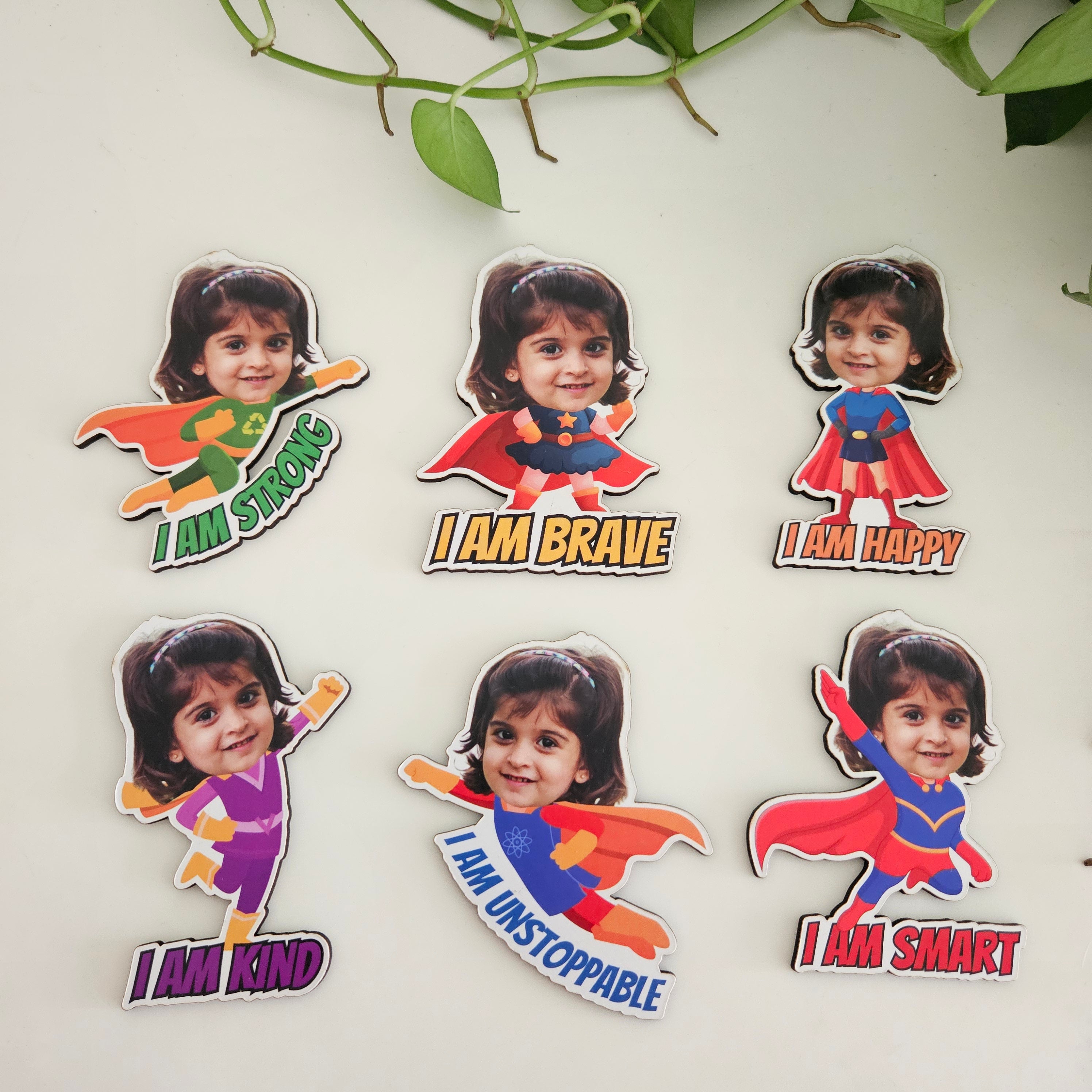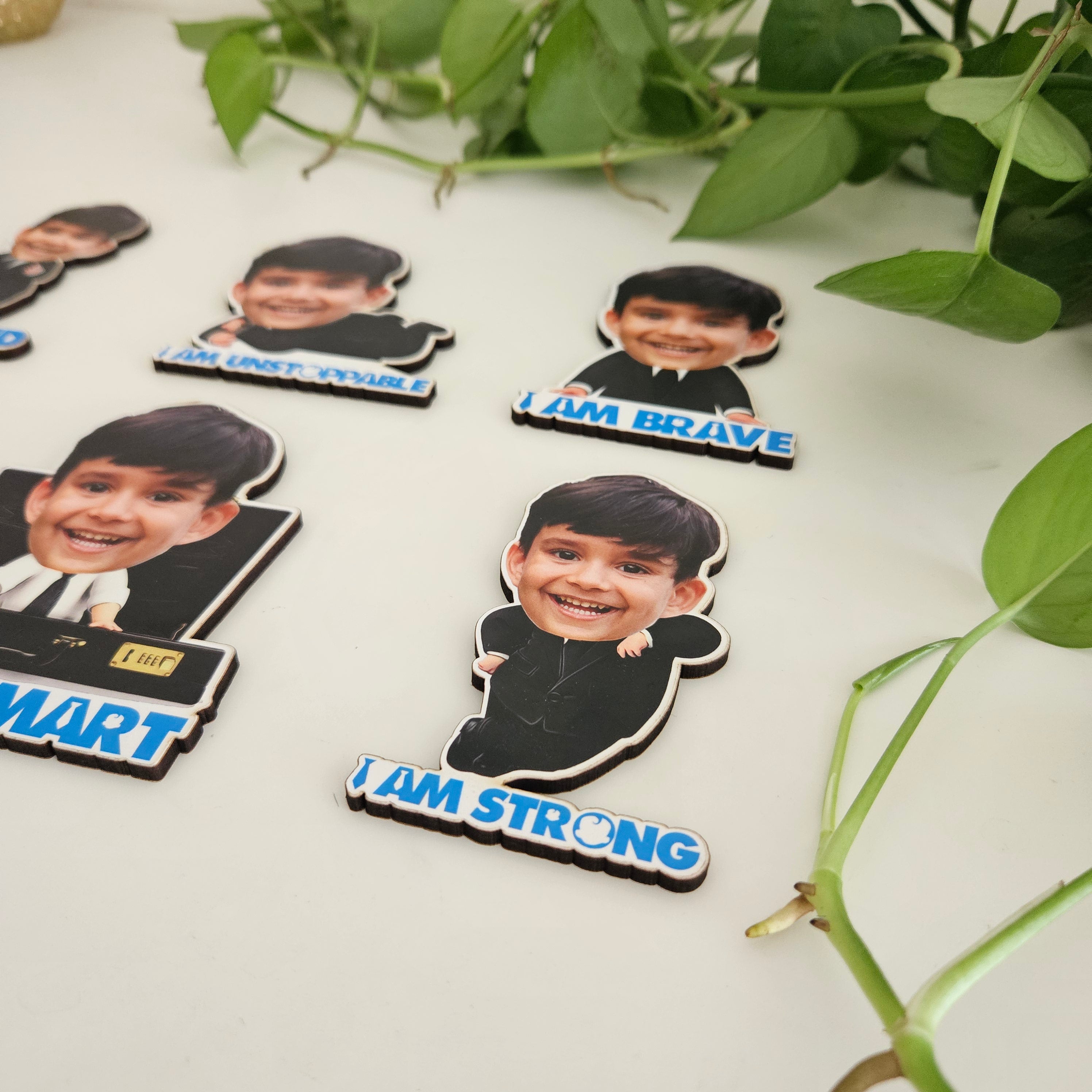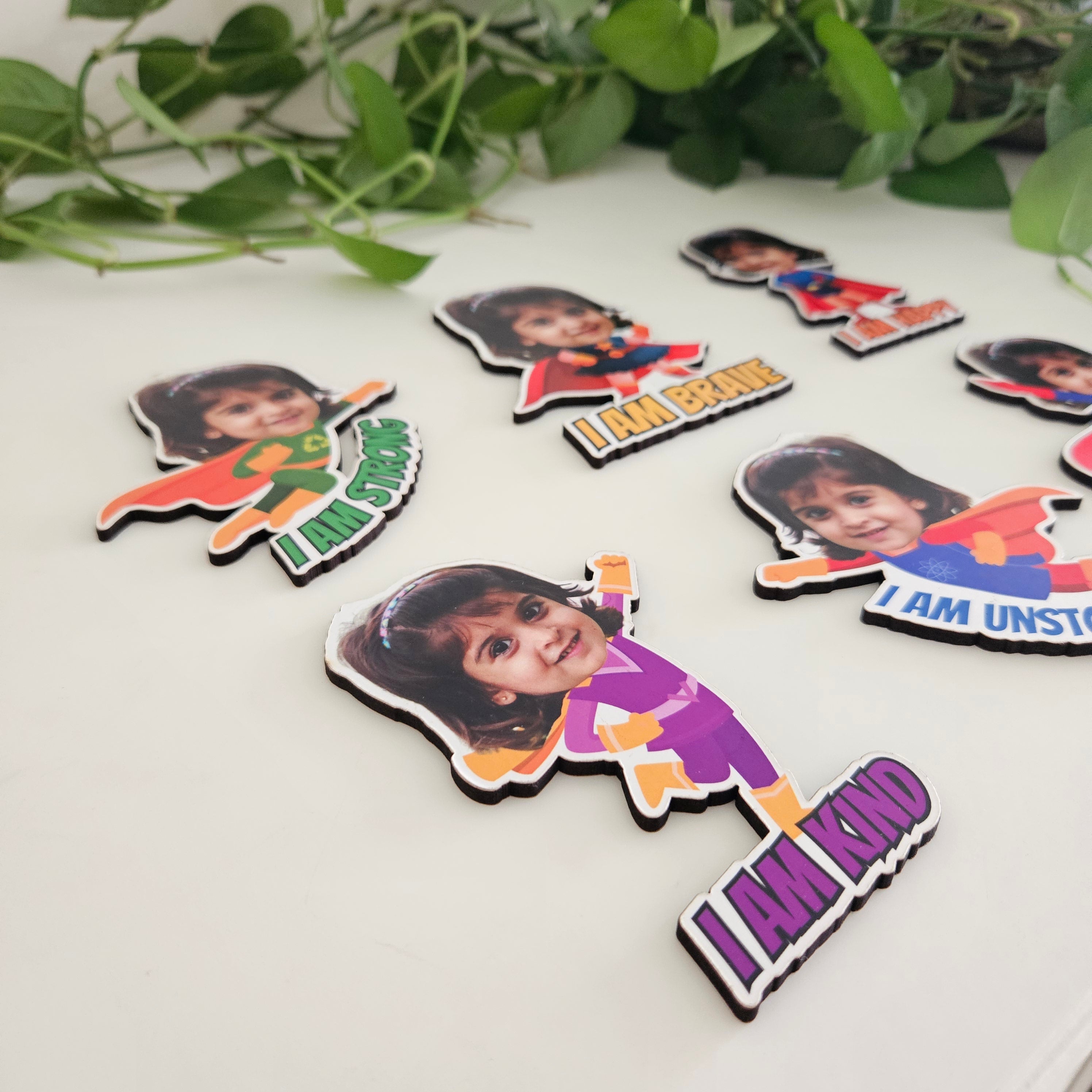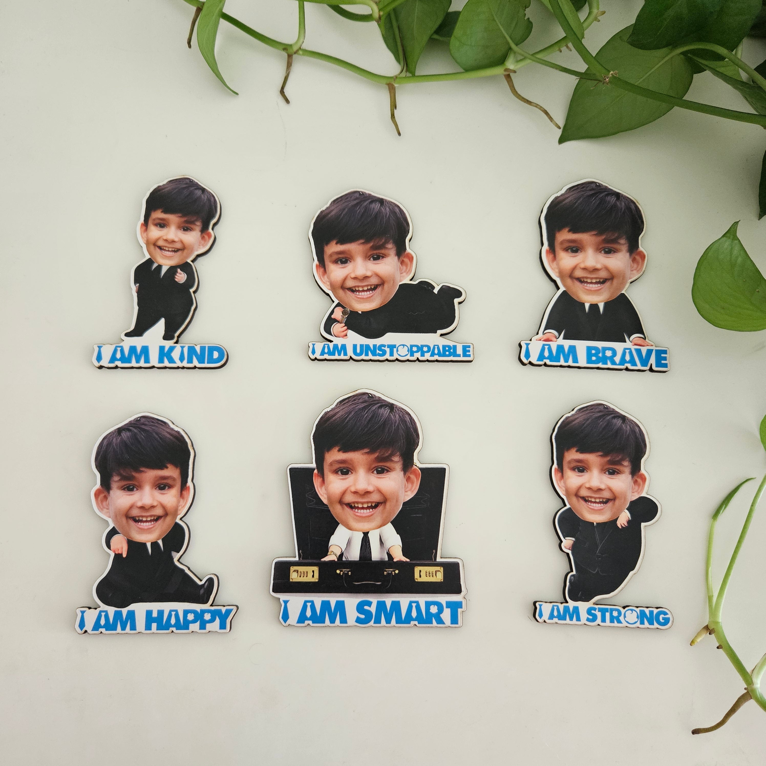 Brighten up your fridge and inspire your little one every day with our Custom Miniature Kids' Fridge Magnets! These adorable, personalized magnets feature your child's face and body in fun themes like superheroes and boss baby, complemented by uplifting daily affirmations to boost their confidence and self-esteem.