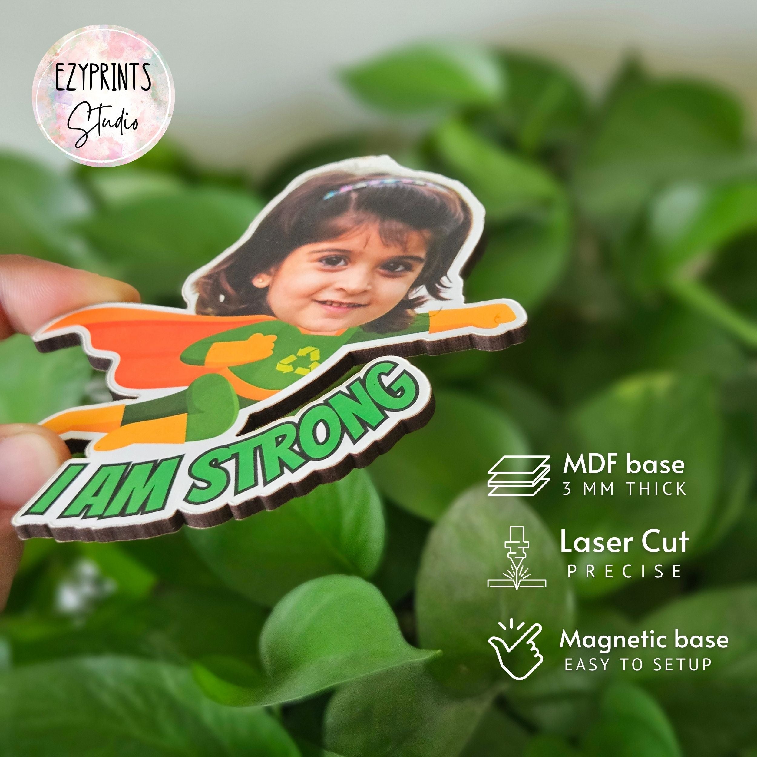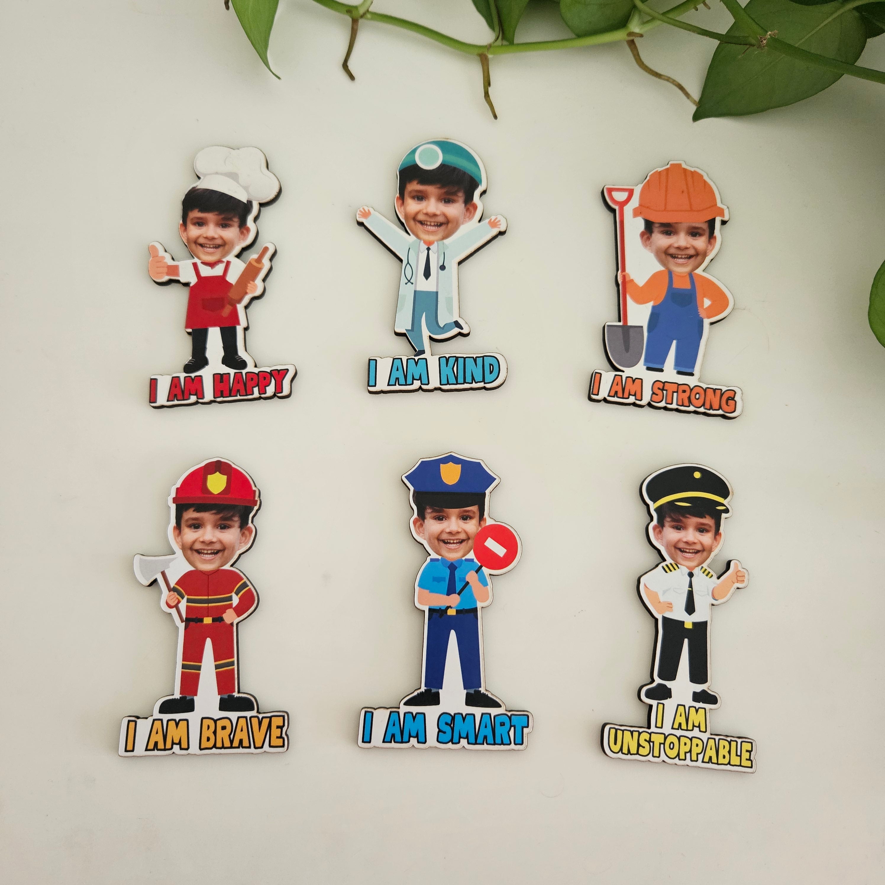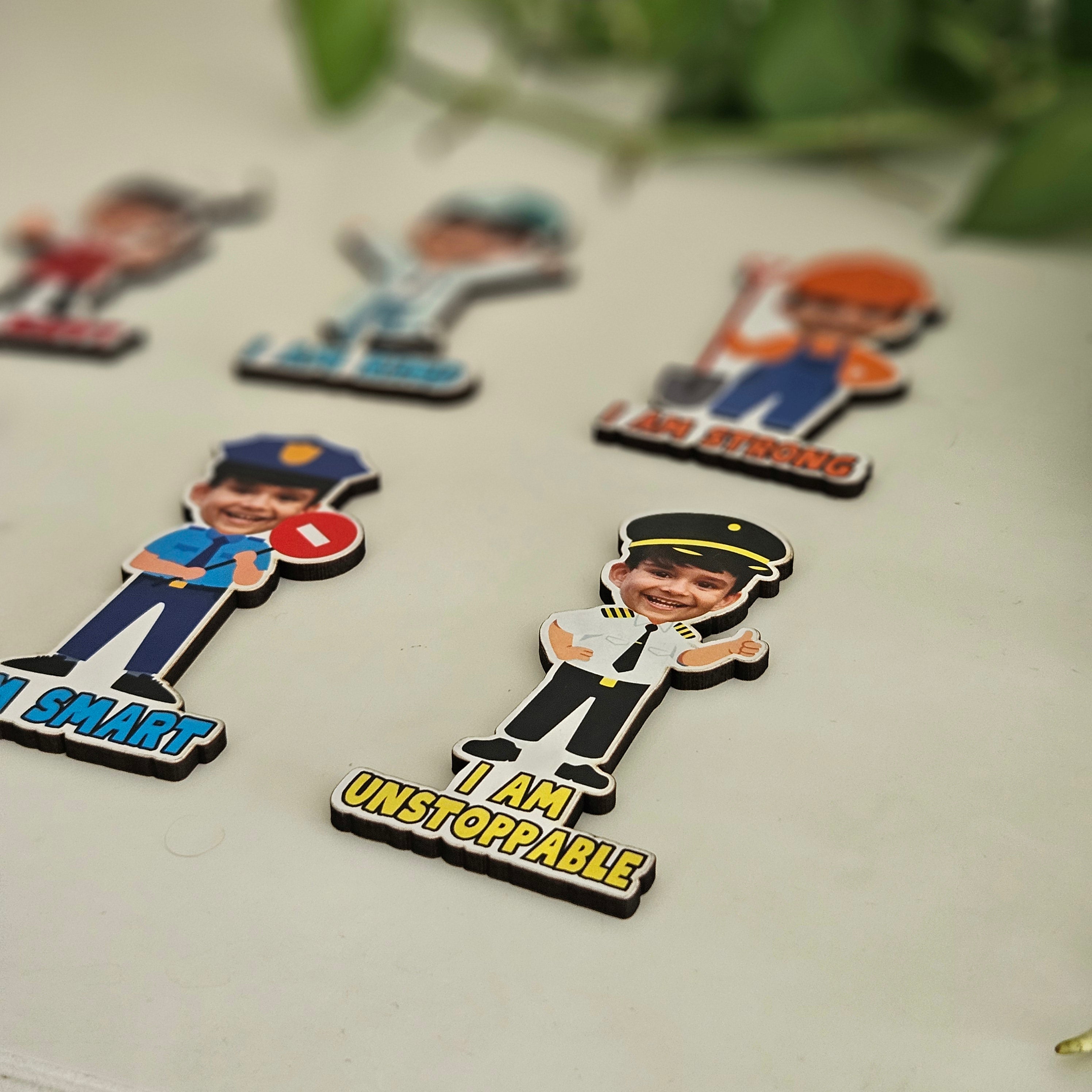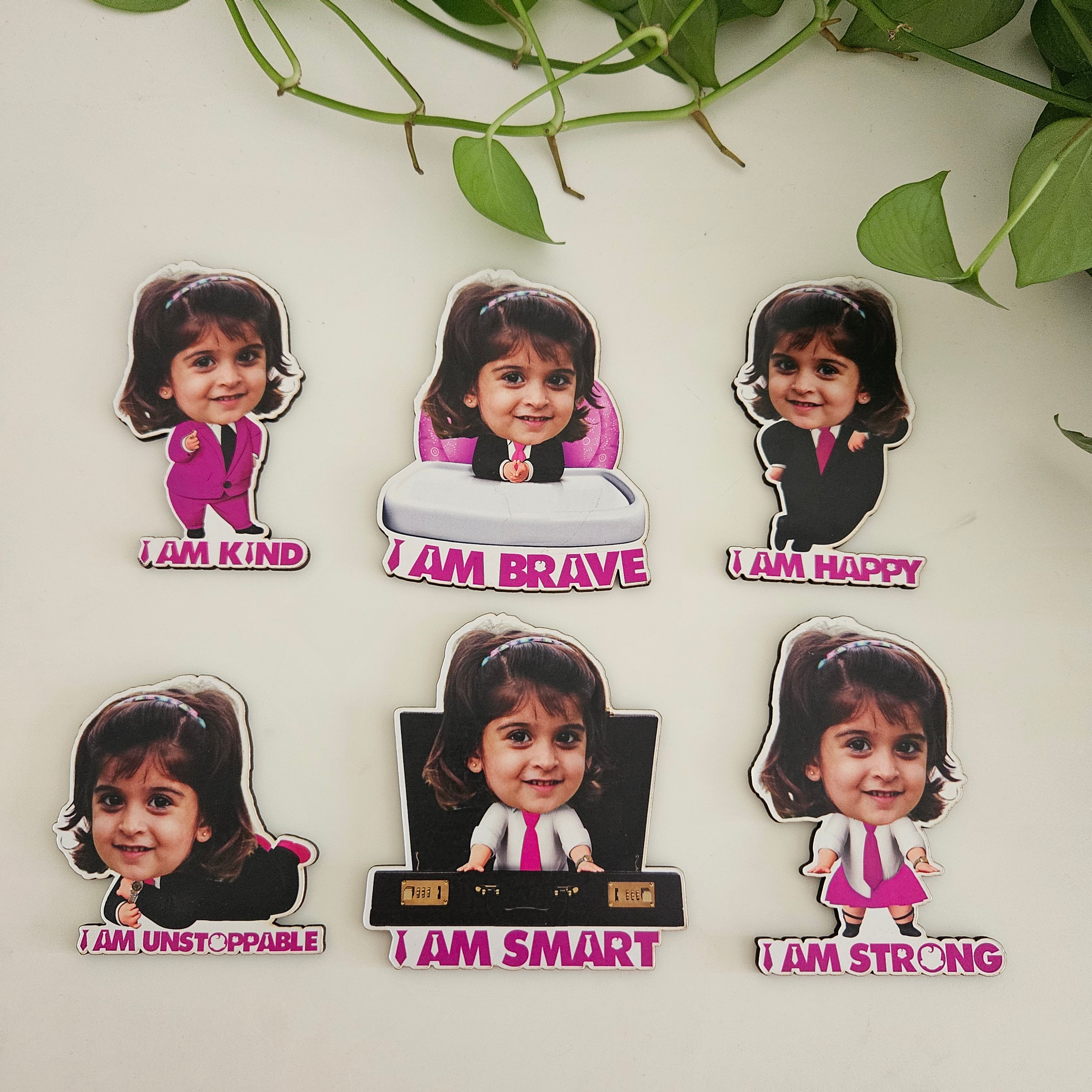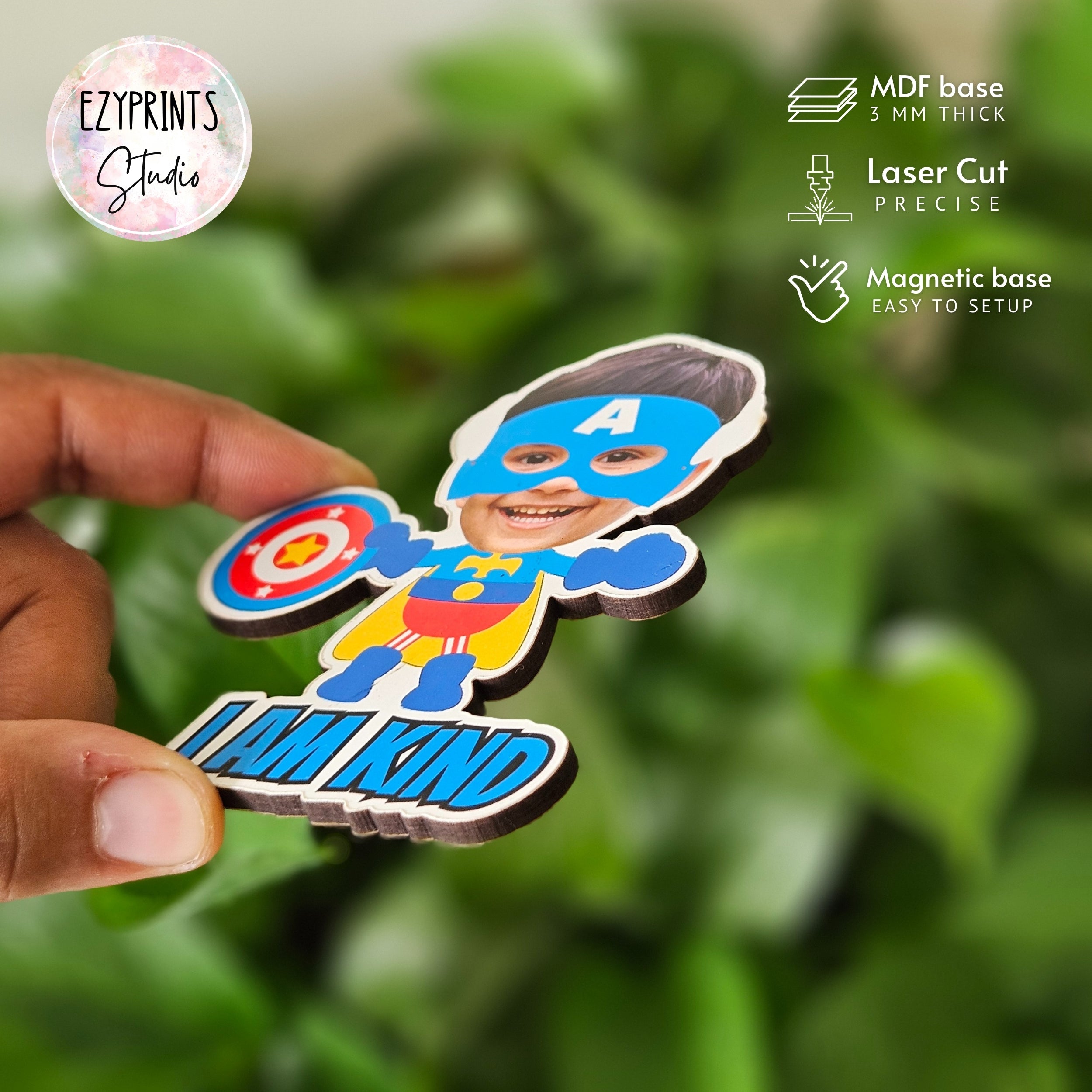 Brighten up your fridge and inspire your little one every day with our Custom Miniature Kids' Fridge Magnets! These adorable, personalized magnets feature your child's face and body in fun themes like superheroes and boss baby, complemented by uplifting daily affirmations to boost their confidence and self-esteem.